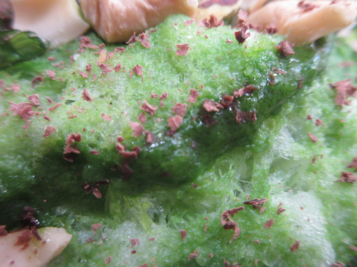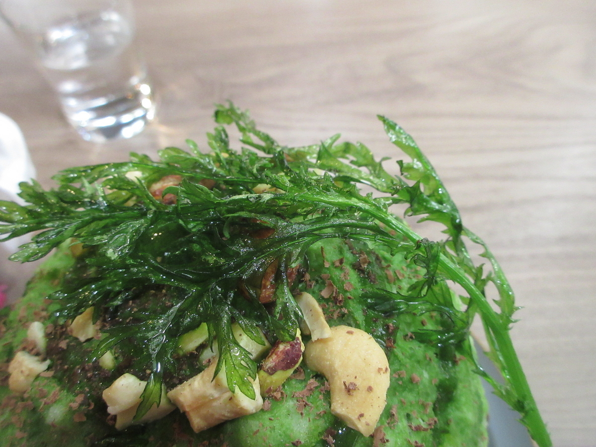 春菊以外にはナッツやチョコチップといったトッピングが施されています。春菊の風味が抑え目なせいか、組み合わせの違和感はありません。ほんのりチョコのコク、ナッツの食感が口の中に変化を与えてくれます。