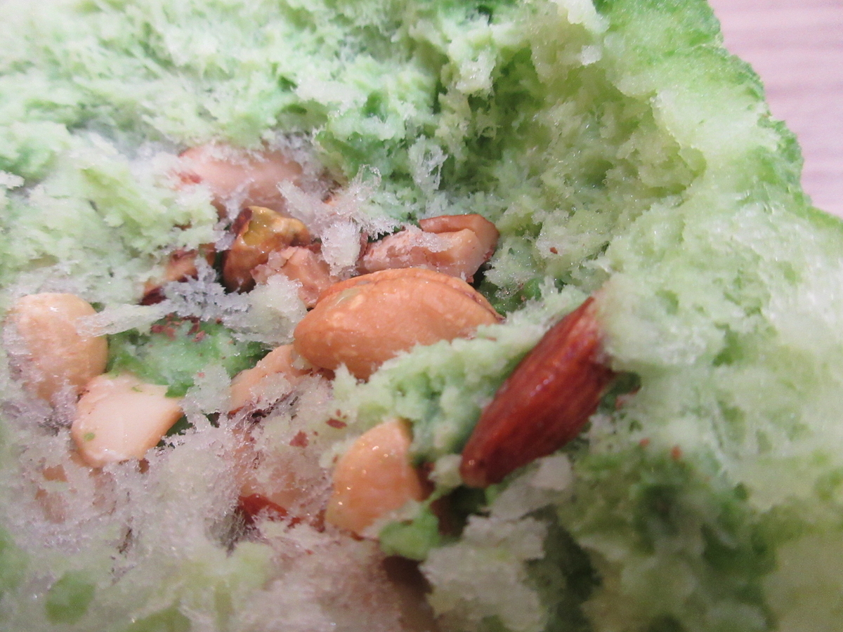 氷の表面だけでなく、氷の中にもありました。ナッツぎっしり。春菊も合わせて色んな食感が揃ってるかき氷です。